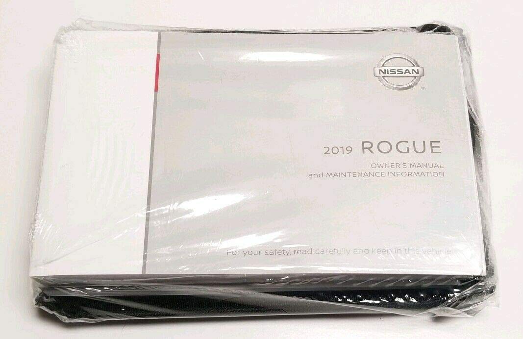 Image: The front cover of the 2019 Nissan Rogue Owner's Manual, a paperback book with the Nissan logo and vehicle model year.