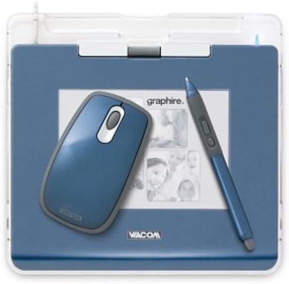 Image: The Wacom Graphire4 4x5 USB Tablet in blue, shown with its accompanying digital pen and cordless mouse. The tablet features a transparent photo frame area and the Wacom logo.