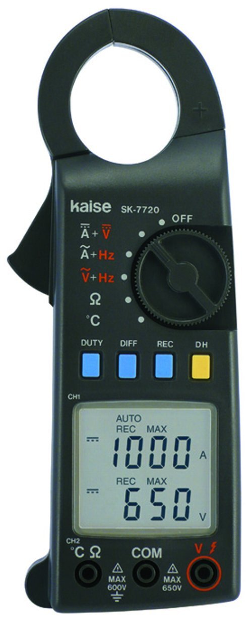 This image displays the KAISE SK-7720 Clamp Meter. It features a black body with a large clamp jaw at the top for non-contact current measurement. The front panel includes a rotary switch for function selection (OFF, DC Current + DC Voltage, AC Current + Frequency, AC Voltage + Frequency, Resistance, Temperature), four blue buttons (DUTY, DIFF, REC), and one yellow button (DH for Data Hold). A clear LCD screen shows measurement values, such as '1000 A' and '650 V'. Below the screen are input terminals labeled CH2 (°C Ω), COM (Common), and VΩ, with maximum voltage ratings indicated (MAX 600V, MAX 650V).