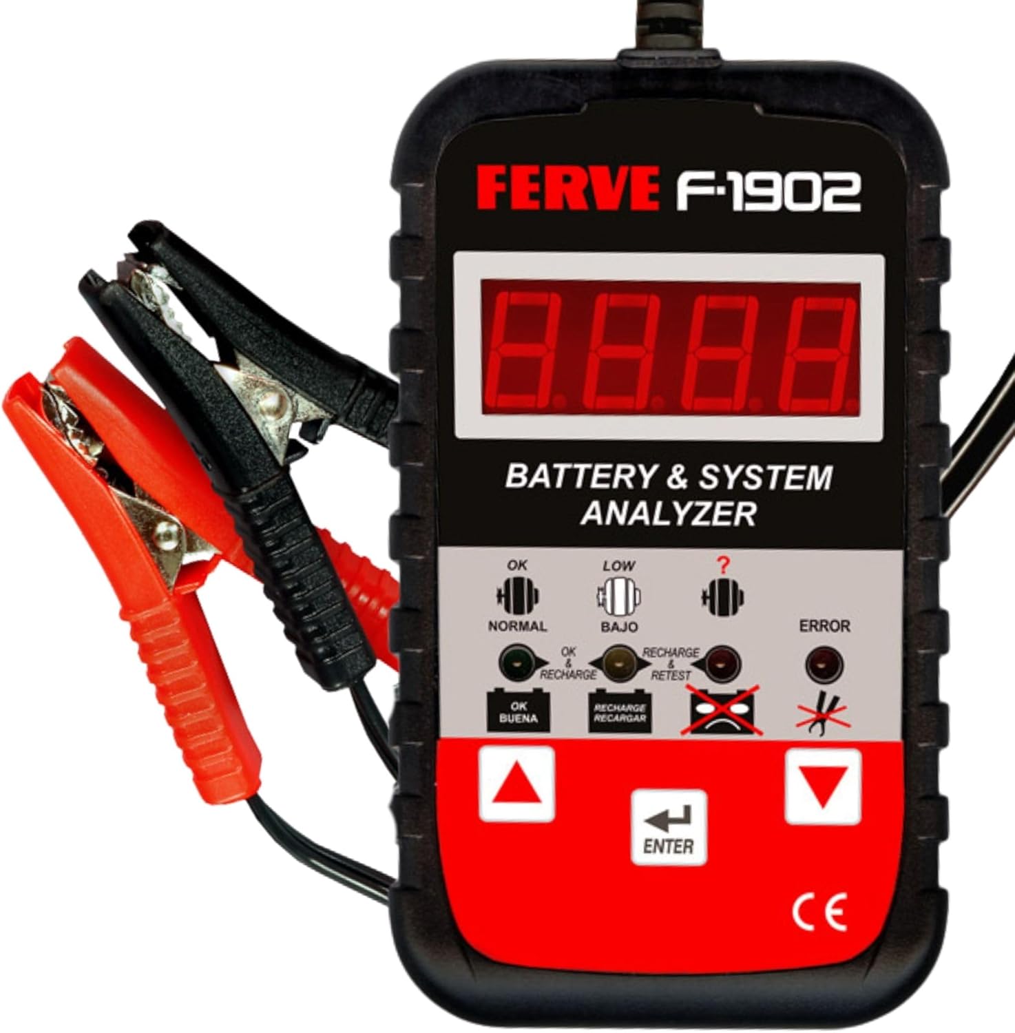 The FERVE F-1902 is a compact, microprocessor-controlled diagnostic tool for 12V vehicle electrical systems. It operates without internal batteries, drawing power directly from the battery being tested. Key features include: