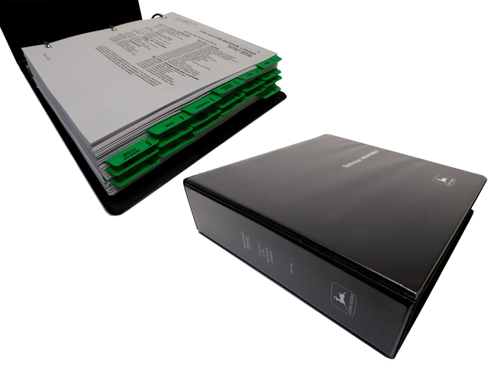 ചിത്രം 1: ഓവർview of the John Deere 310A and 310B Backhoe Loader Service Manual, showing its ring-bound format and tabbed sections for easy navigation.