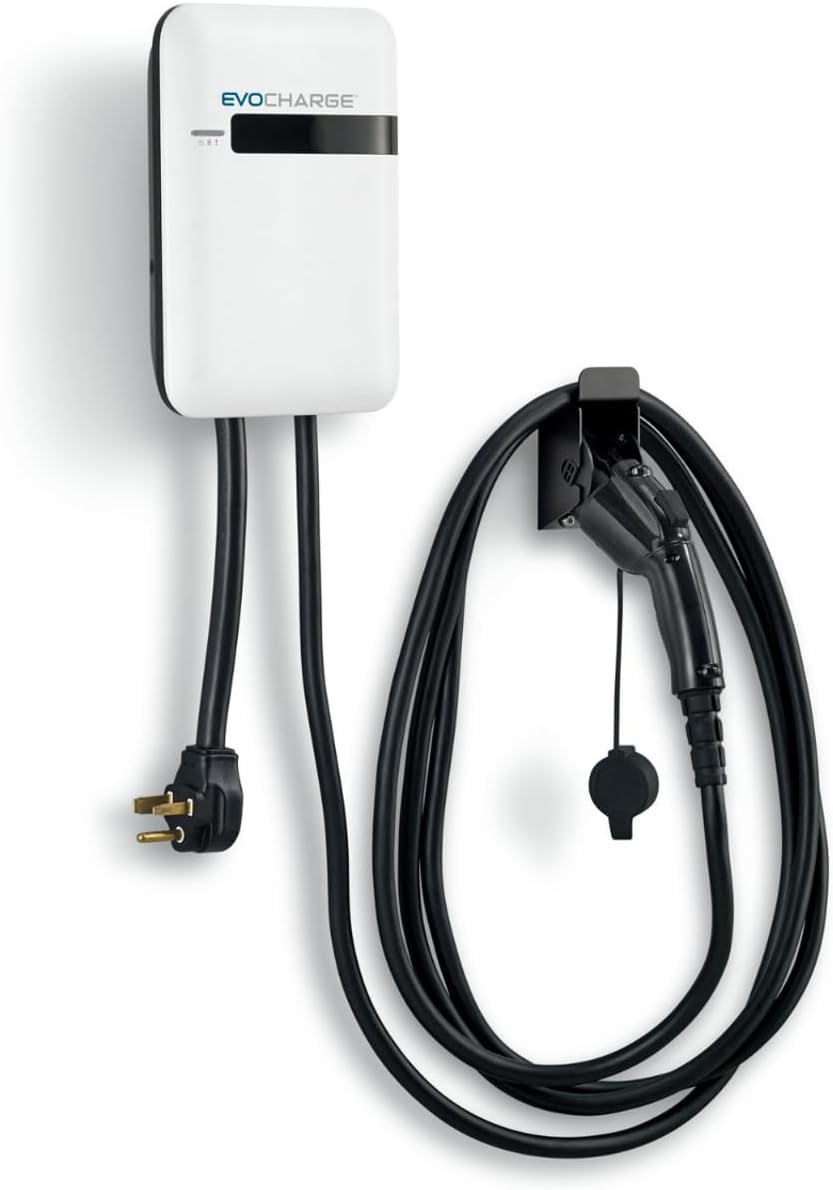 Image 1: The EVoCharge Level 2 EV Charger, showing the main unit, NEMA 6-50 power plug, and the J1772 charging connector with its holster.