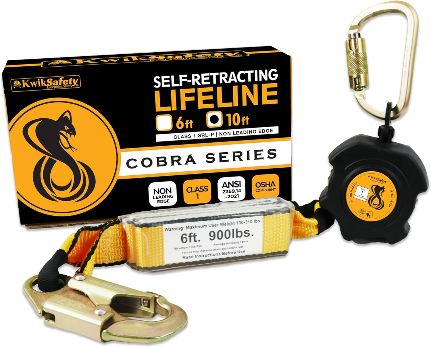Image 1.1: KwikSafety Cobra Web 10FT Single-Leg Self-Retracting Lifeline, showing the housing, webbing, snap hook, and carabiner.