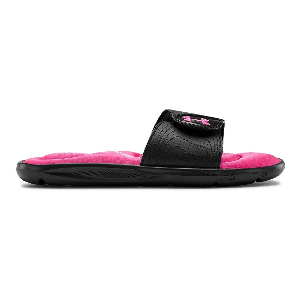 ചിത്രം 1: വശം view of the Under Armour Ignite IX Slide sandal. The sandal features a black adjustable strap with a pink Under Armour logo, a vibrant pink contoured footbed, and a black outsole with textured detailing.