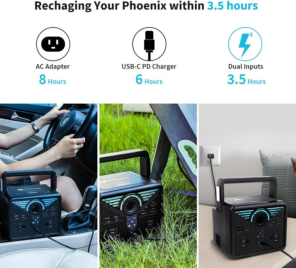 ചിത്രം: The Renogy Phoenix 300 can be recharged within 3.5 hours using dual inputs. It shows recharging options via AC Adapter (8 hours), USB-C PD Charger (6 hours), and Dual Inputs (3.5 hours), with accompanying images of the power station being charged in a car, with a solar panel, and via a wall outlet.
