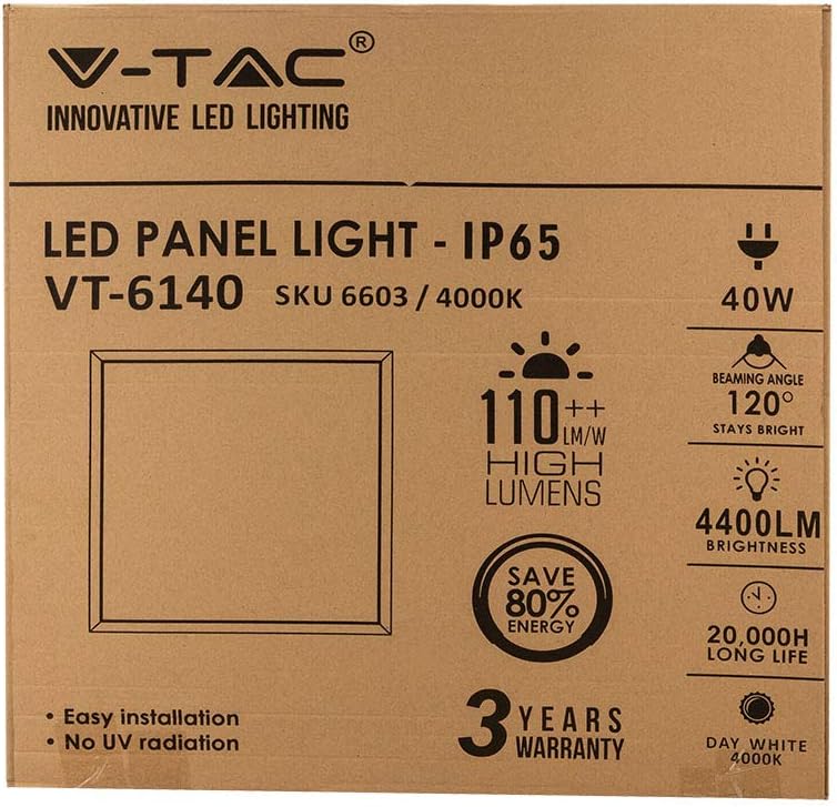 Thank you for choosing the V-TAC VT-6140 40W LED Panel. This manual provides essential information for the safe installation, operation, and maintenance of your LED panel. The VT-6140 is a 40W LED panel, measuring 595x595mm, designed to provide 4000K day white light. Its IP65 rating makes it suitable for both indoor and outdoor installations where protection against dust and water jets is required. It includes a high-quality IP65 driver, ensuring reliable performance and a high light transmission rate.