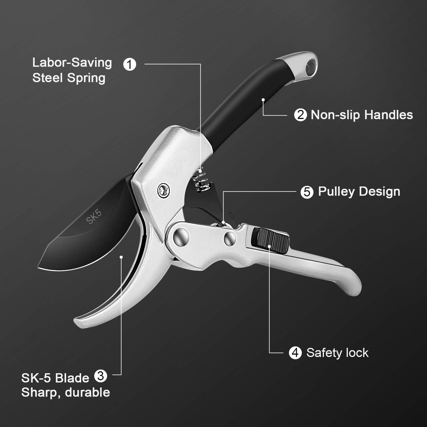 - Effortless Cutting (Pulley Mechanism): Features a pulley design and spring-loaded mechanism that reduces the force required to cut branches, providing increasing pressure as you squeeze.