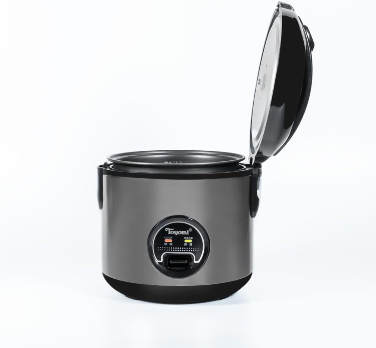 Image: The Toyomi RC 708SS Stainless Steel Rice Cooker with its lid open, showing the non-stick inner pot.