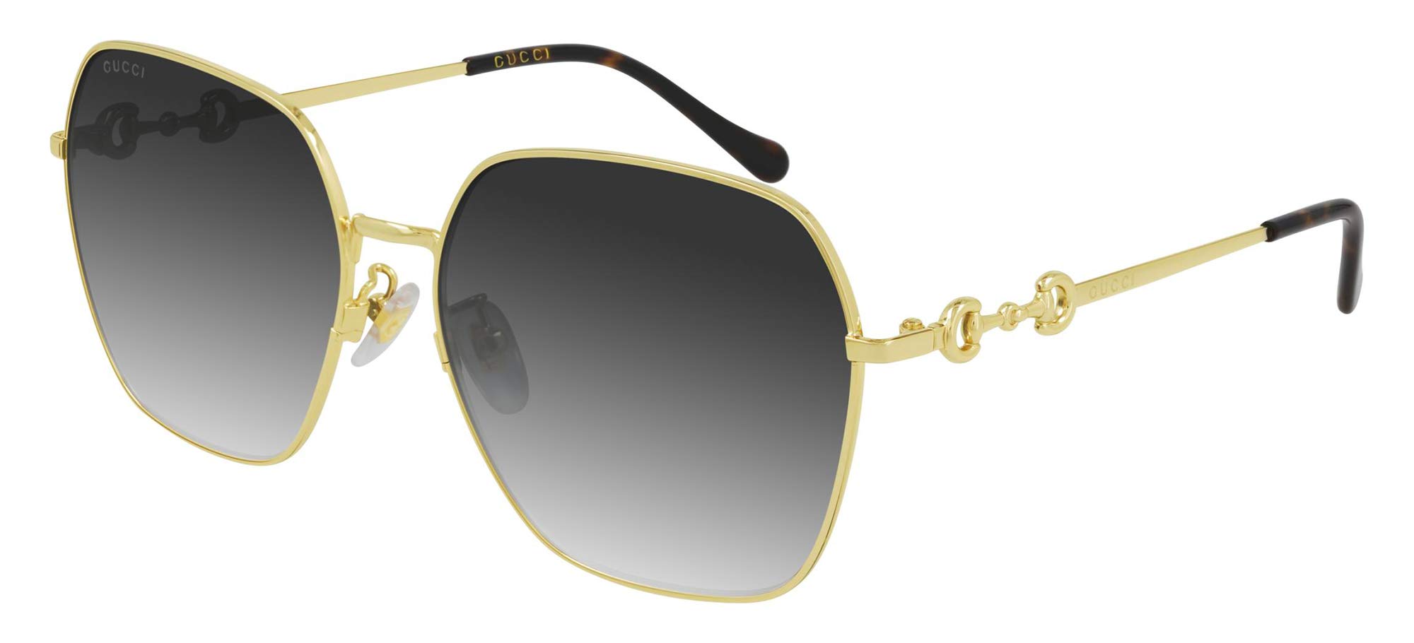 The Gucci GG 0882SA sunglasses are a metal full-rim square-shaped eyewear designed for women. This model features the iconic Gucci Horsebit detail on the temples, accompanied by a discreet Gucci Lettering Logo. The frame is constructed from metal, providing a durable and stylish design.
