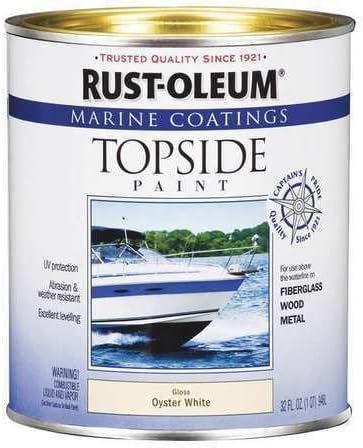 This image displays a 1-quart can of Rust-Oleum Marine Coatings Topside Paint. The label indicates it is Oyster White in color with a gloss finish, suitable for fiberglass, wood, and metal surfaces above the waterline. Key features such as UV protection, abrasion and weather resistance, and excellent leveling are highlighted on the label.