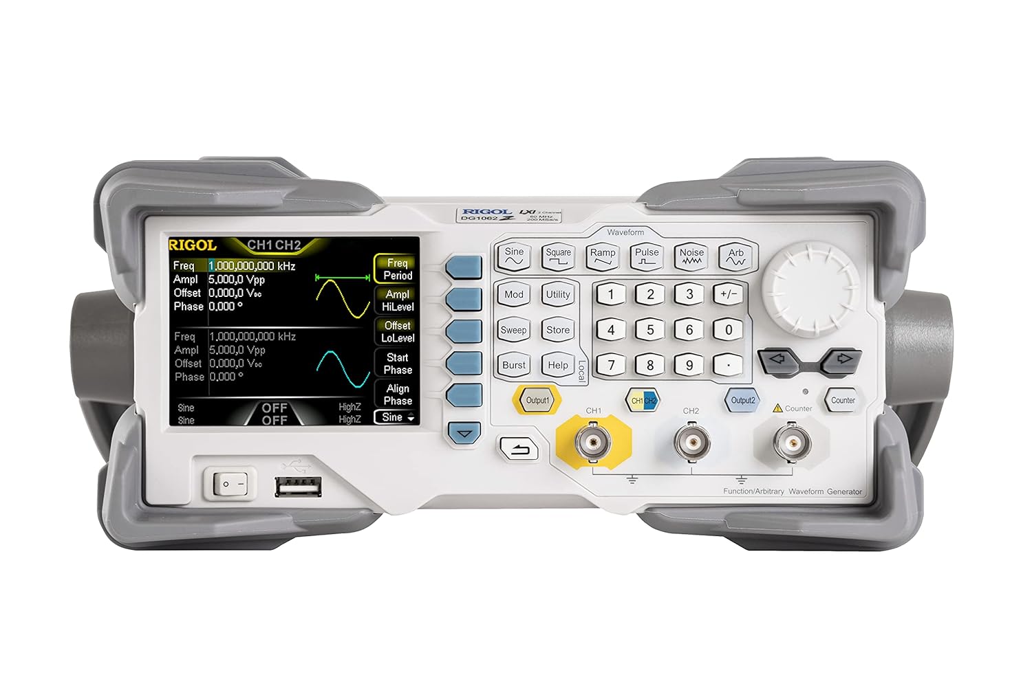 The front panel of the DG1062Z is designed for intuitive operation. It includes a color LCD display, waveform selection buttons, numeric keypad, navigation keys, and output connectors.