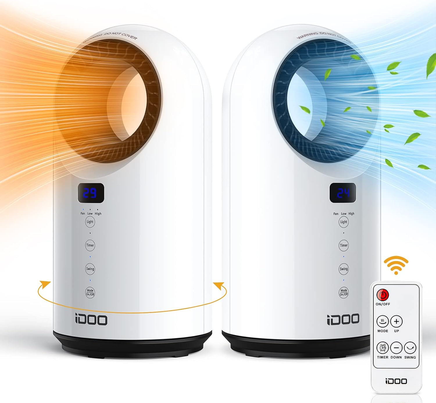 Image: The iDOO Electric Space Heater, a white tower-style unit, with its remote control. It illustrates both warm orange air and cool blue air emanating from the unit, highlighting its dual heating and fan functions.