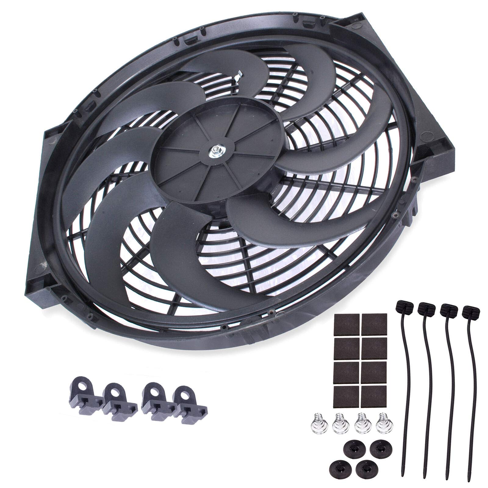 - മൗണ്ടിംഗ്: Use the provided mounting kit (straps, foam pads, springs, washers) to securely attach the fan to the radiator or condenser. Ensure the fan is centered and does not obstruct other components. The foam pads help reduce vibration and protect the radiator fins.