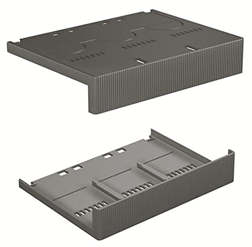 Image: Two ABB LTC Low Terminal Covers. The top cover is shown from a slightly elevated angle, revealing its flat top surface with embossed patterns and ribbed side. The bottom cover is inverted, showing the internal structure designed to house electrical terminals, also with ribbed sides. Both covers are dark grey.