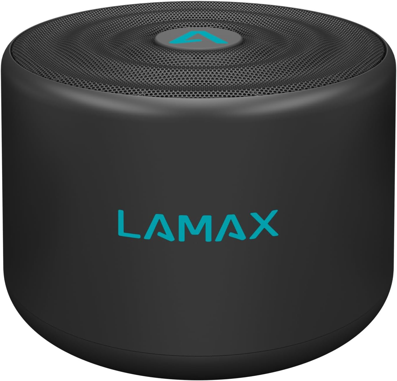 Image 1.1: The Lamax Sphere2 portable speaker, black with a teal Lamax logo on the front and top.