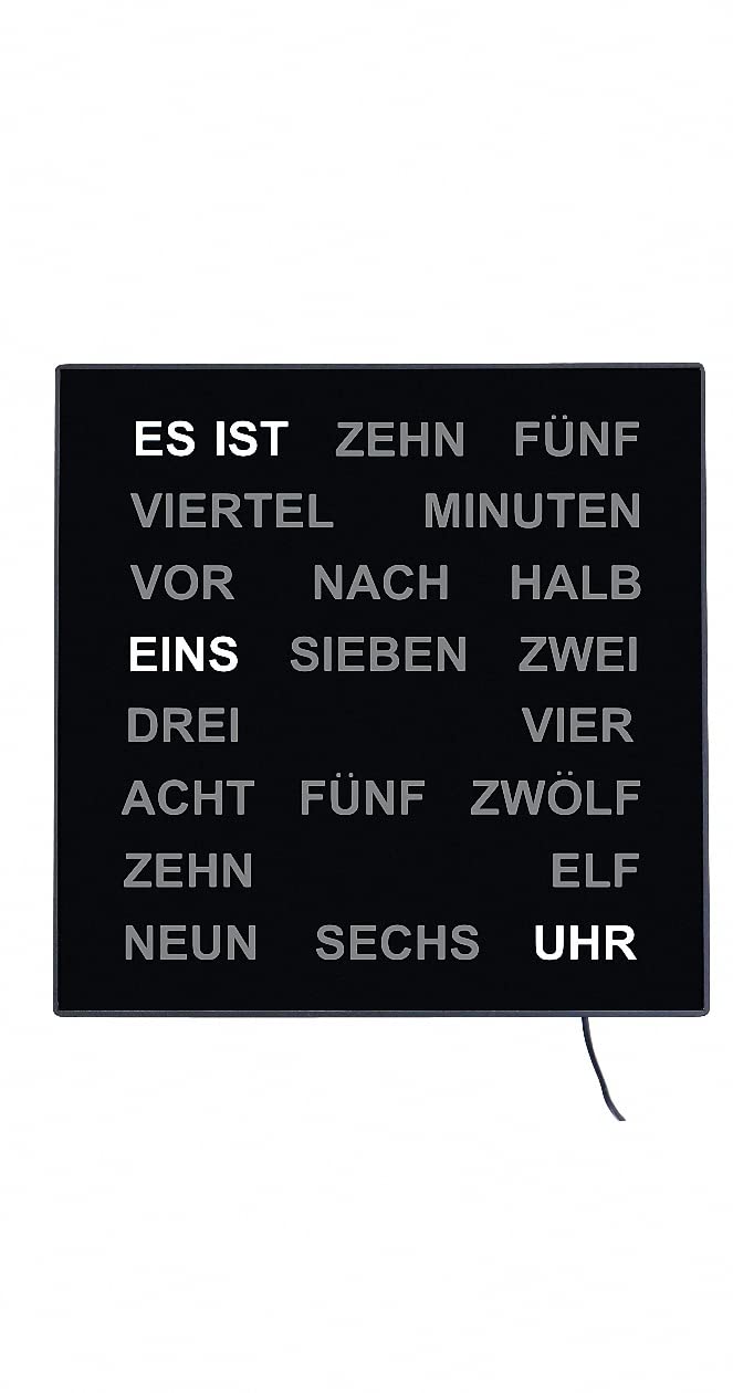 The AMS Modern Wall Clock displays time using illuminated words. The display changes every five minutes. For example, if it is 1:00, the words "ES IST EINS UHR" will illuminate. If it is 1:05, it might show "ES IST FÜNF NACH EINS".