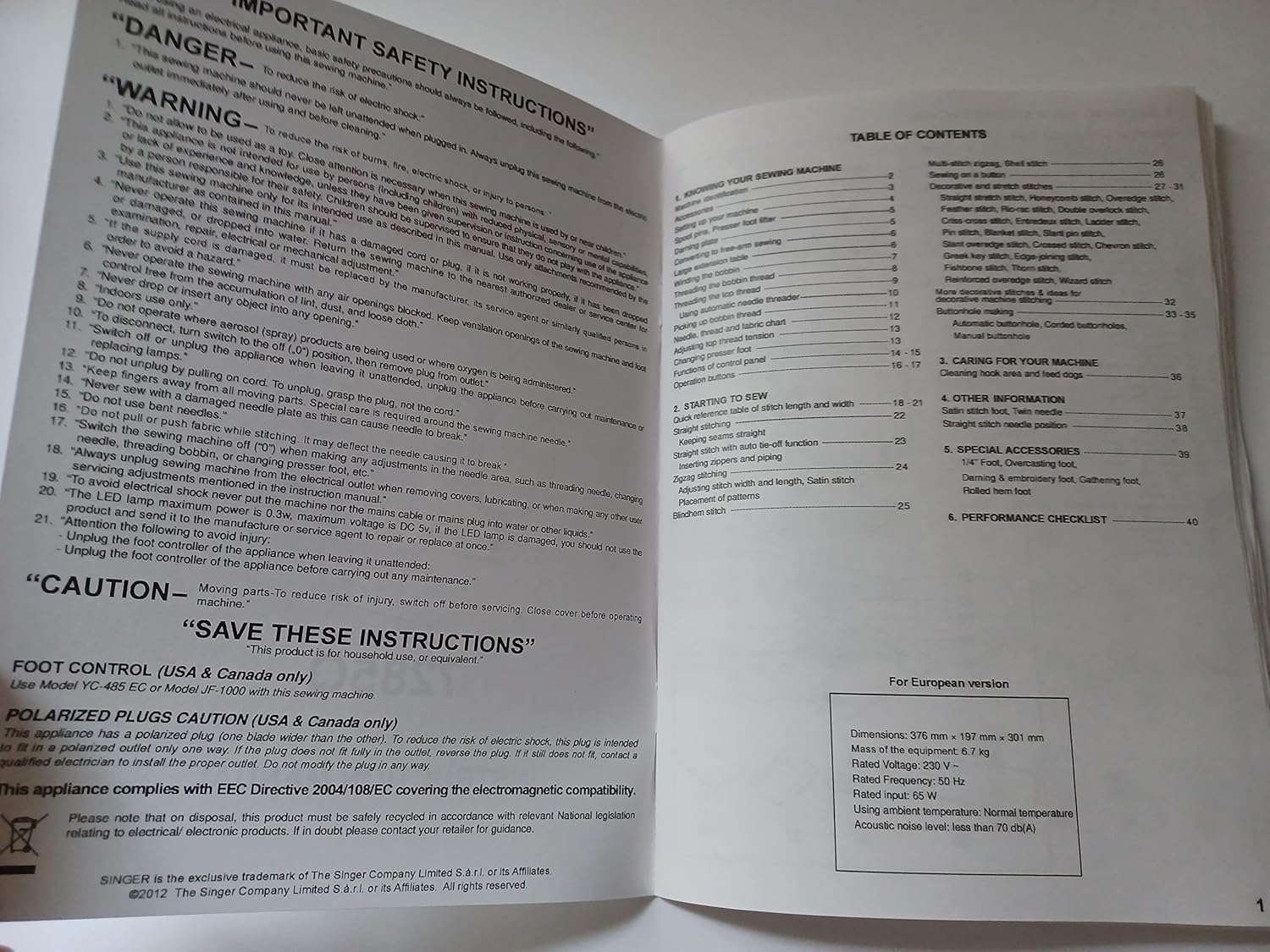 Image: Page 2 of the manual detailing important safety instructions and a glimpse of the table of contents.