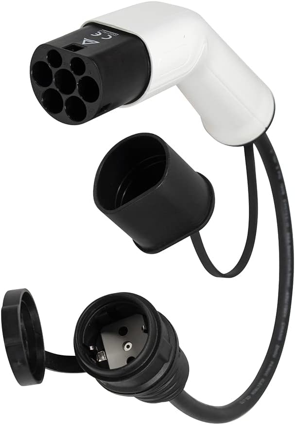 The EV charging adapter facilitates connection between an electric vehicle with a Type 2 charging inlet and a standard Schuko power outlet for charging. It is designed for durability and safe operation.
