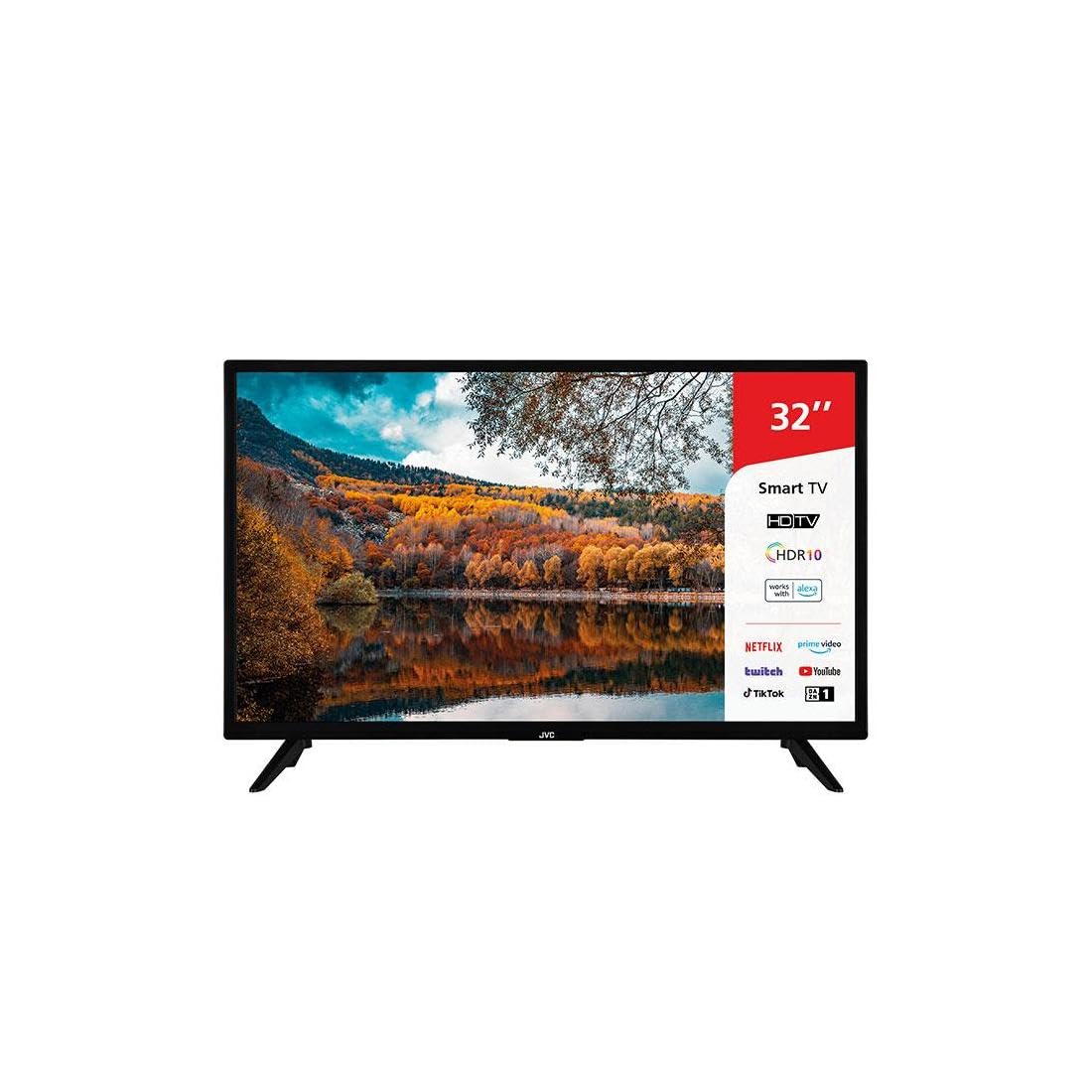 This image shows the JVC LT-32VH3101 32-inch Smart LED TV from the front, featuring a slim black bezel and two V-shaped stand feet. The screen displays a colorful autumn landscape with a lake reflecting the trees and sky. On the right side of the screen, a red and white overlay highlights key features such as '32"', 'Smart TV', 'HDTV', 'HDR10', 'works with alexa', and logos for streaming services like Netflix, Prime Video, Twitch, YouTube, TikTok, and DAZN.