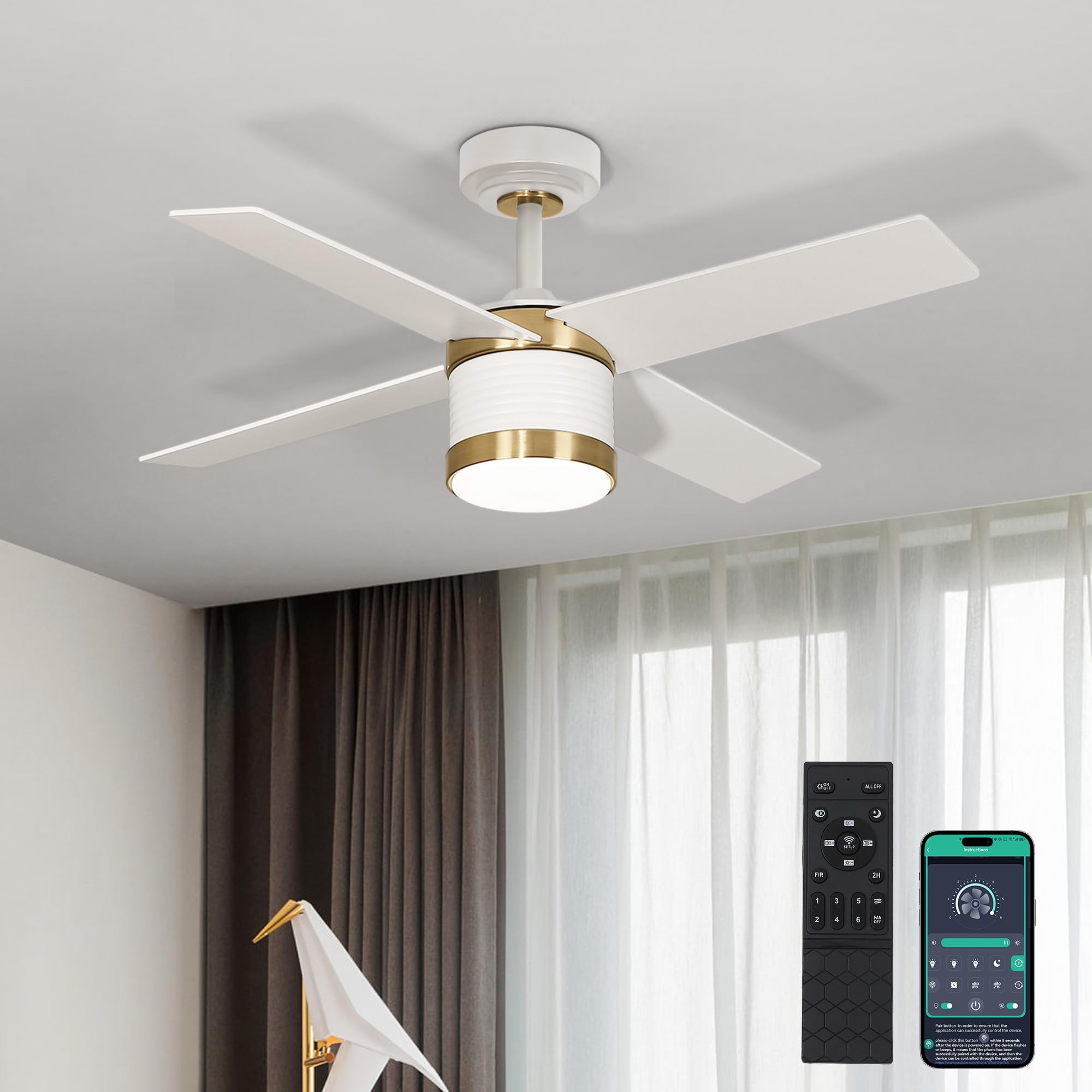 This ceiling fan features a 42-inch span, integrated LED lighting with dimmable and color temperature adjustment, a quiet DC motor, 6-speed settings, and reversible blades for all-season use. It is designed for indoor use in various rooms such as living rooms, bedrooms, offices, kitchens, and dining rooms.