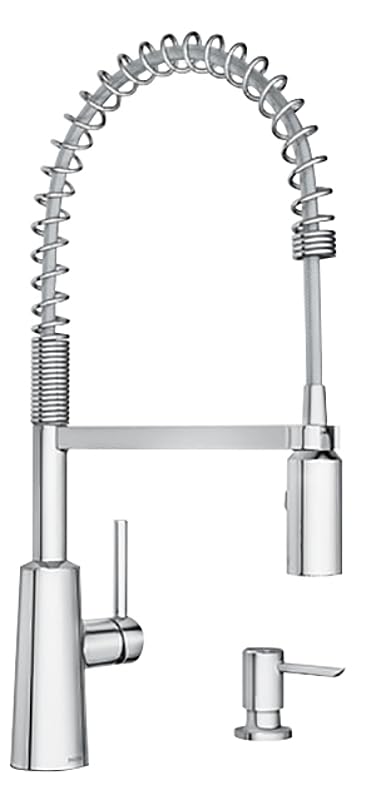 ഈ ചിത്രം പൂർണ്ണമായ Moen KTN Spring NORI Chrome Faucet സിസ്റ്റം പ്രദർശിപ്പിക്കുന്നു. ഉയരമുള്ളതും വളഞ്ഞതുമായ ഒരു കഴുത്തും ദൃശ്യമായ ഒരു സ്പ്രിംഗ് കോയിലും ഇതിന്റെ സവിശേഷതയാണ്, ഇത് പുൾ-ഡൗൺ സ്പ്രേയർ പ്രവർത്തനക്ഷമതയെ സൂചിപ്പിക്കുന്നു. പ്രധാന ഫ്യൂസറ്റ് ബോഡി ഇടതുവശത്താണ്, ജല നിയന്ത്രണത്തിനായി ഒരൊറ്റ ലിവർ ഹാൻഡിൽ ഉണ്ട്. വലതുവശത്ത്, ഒരു പ്രത്യേക, ചെറിയ സോപ്പ് ഡിസ്പെൻസർ ദൃശ്യമാണ്. രണ്ട് ഘടകങ്ങളും മിനുക്കിയ ക്രോമിൽ പൂർത്തിയാക്കിയിരിക്കുന്നു, പ്രകാശം പ്രതിഫലിപ്പിക്കുകയും മിനുസമാർന്നതും ആധുനികവുമായ രൂപകൽപ്പനയെ സൂചിപ്പിക്കുന്നു. മൊത്തത്തിലുള്ള രൂപം കരുത്തുറ്റതും പ്രവർത്തനക്ഷമവുമായ ഒരു അടുക്കള അല്ലെങ്കിൽ യൂട്ടിലിറ്റി ഫ്യൂസറ്റിനെ സൂചിപ്പിക്കുന്നു.
