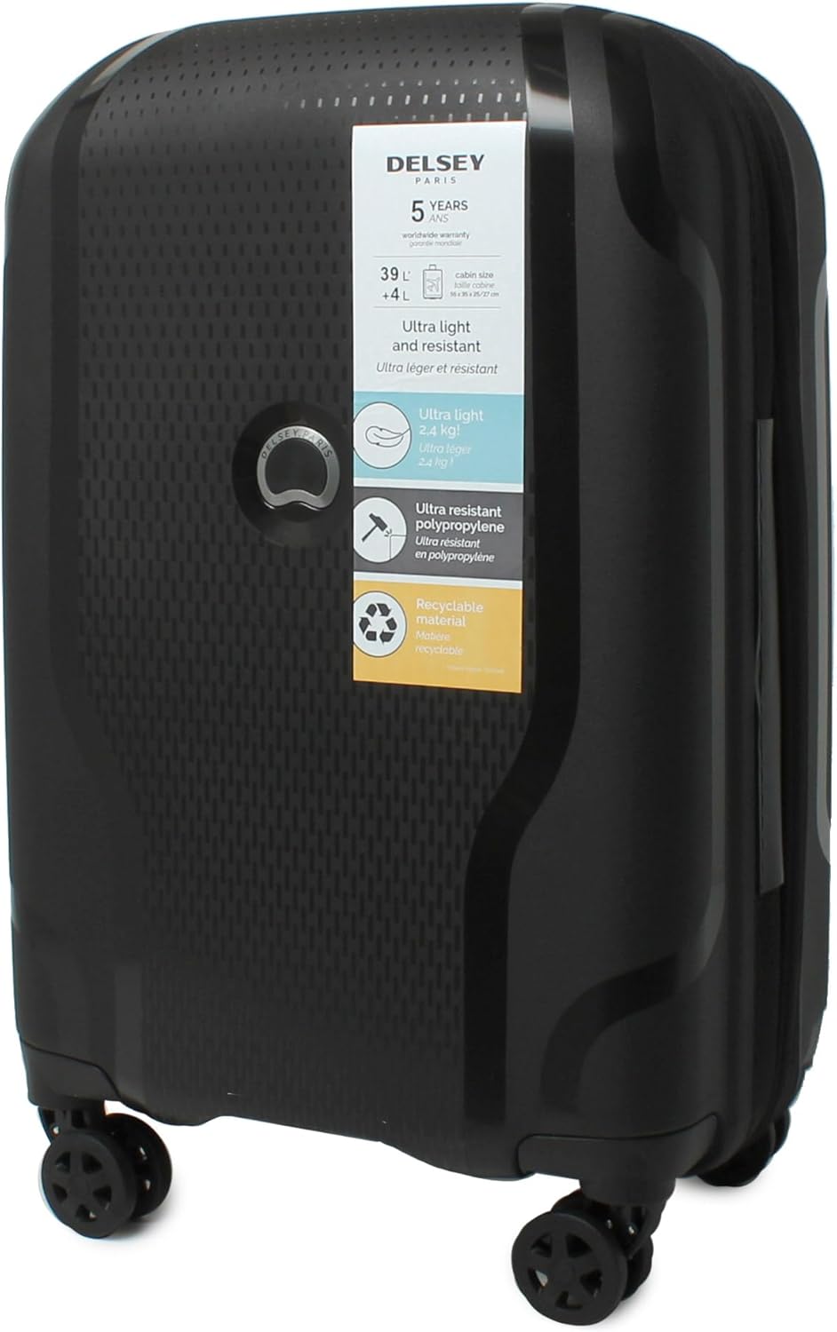 ചിത്രം: മുൻഭാഗം view of the DELSEY CLAVEL EXP suitcase, highlighting its sleek design and the product label detailing features like ultra-lightweight and ultra-resistant polypropylene material.