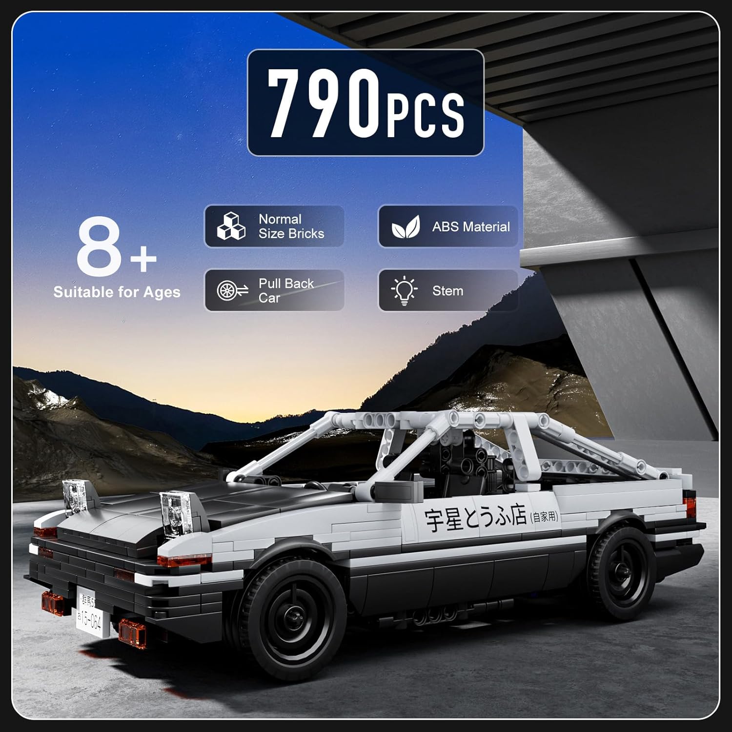Image 1.1: The Mould King AE86 Initial D model kit highlights its 790 pieces, suitability for ages 8+, use of normal size ABS bricks, pull-back car feature, and STEM educational benefits.