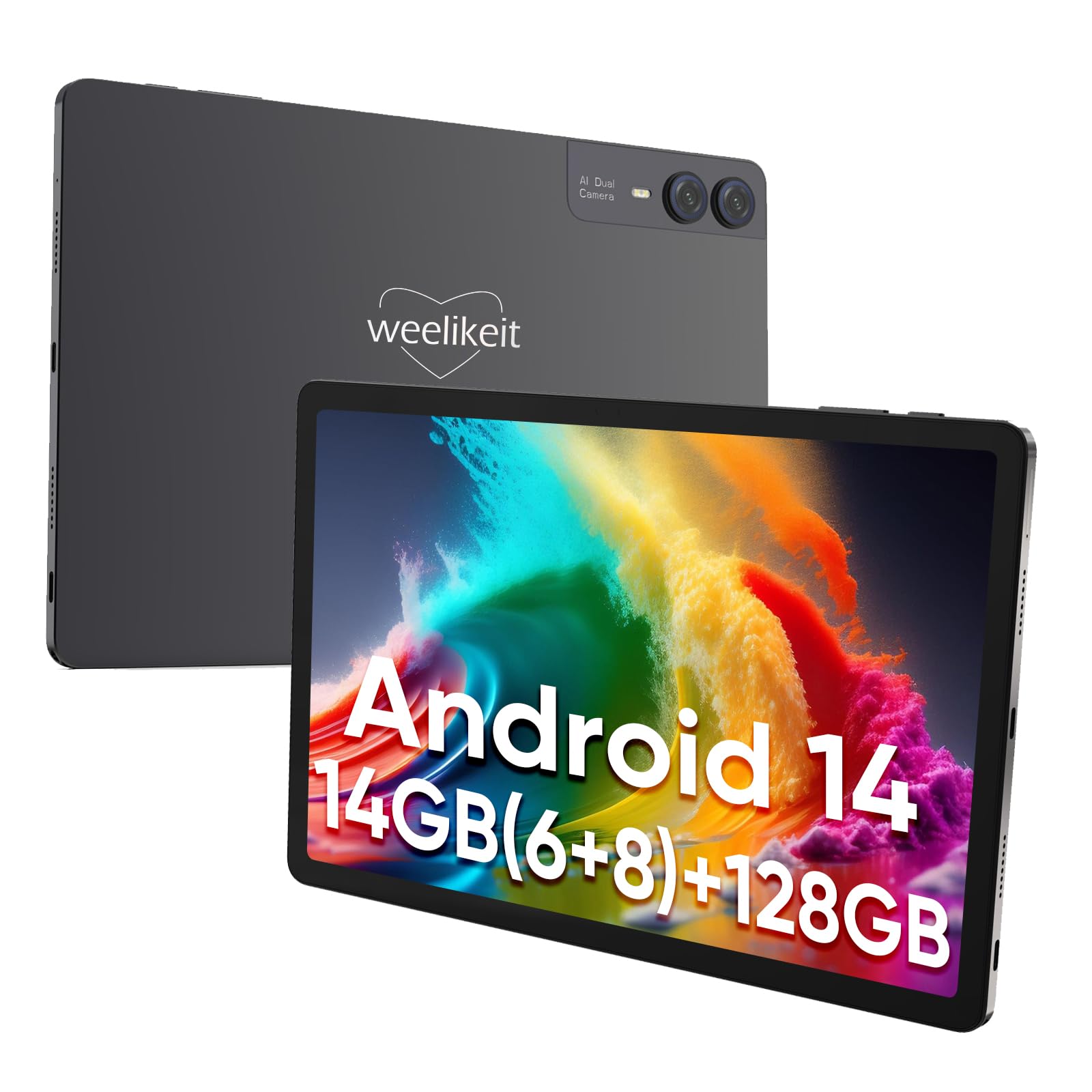 Figure 1.1: weelikeit 11-inch FHD Tablet. This image displays the tablet from both front and rear perspectives, showcasing its sleek design and camera setup.