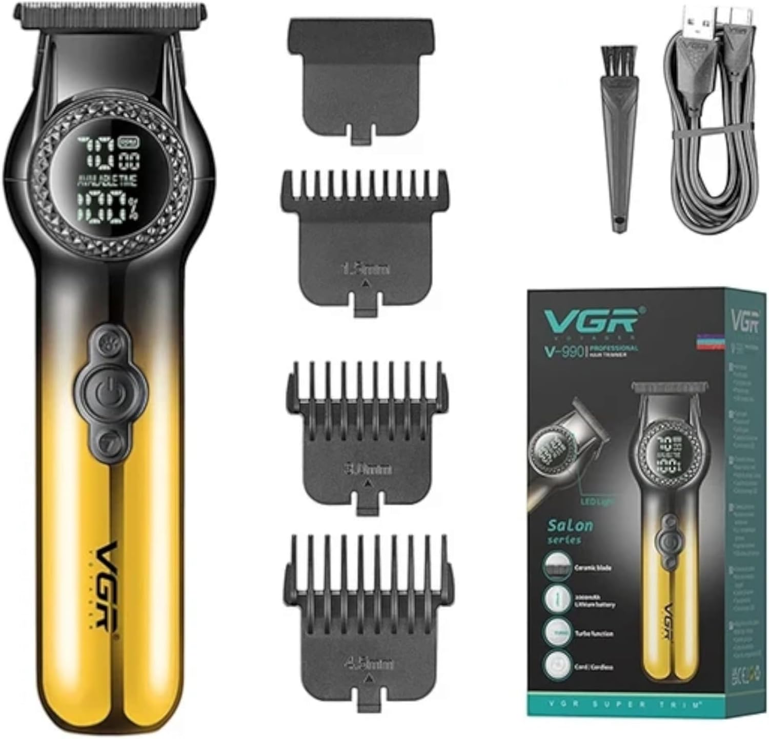 Image: The VGR V-990 hair clipper, along with its included accessories: three guide combs, a USB-C charging cable, and a cleaning brush. The product packaging is also visible.