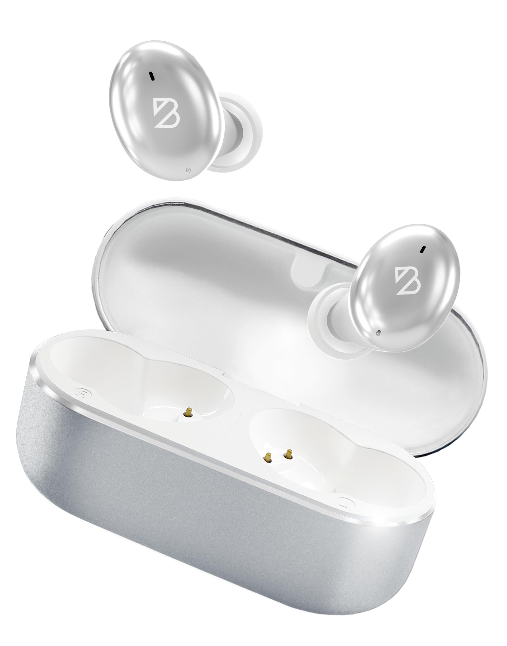 Image: Back Bay Audio Tempo 30 Wireless Earbuds in silver, showcasinഅവരുടെ മിനുസമാർന്ന ഡിസൈൻ.