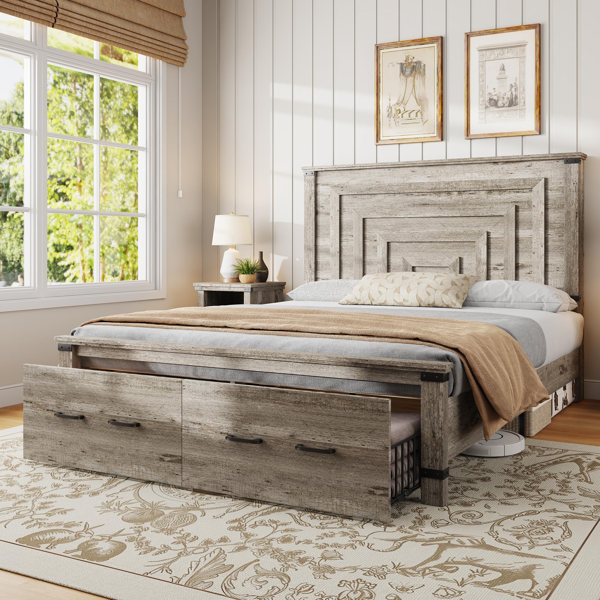 Image: The AMERLIFE Farmhouse Full Size Bed Frame in Rustic Grey, showcasing its geometric headboard and footboard with storage drawers.