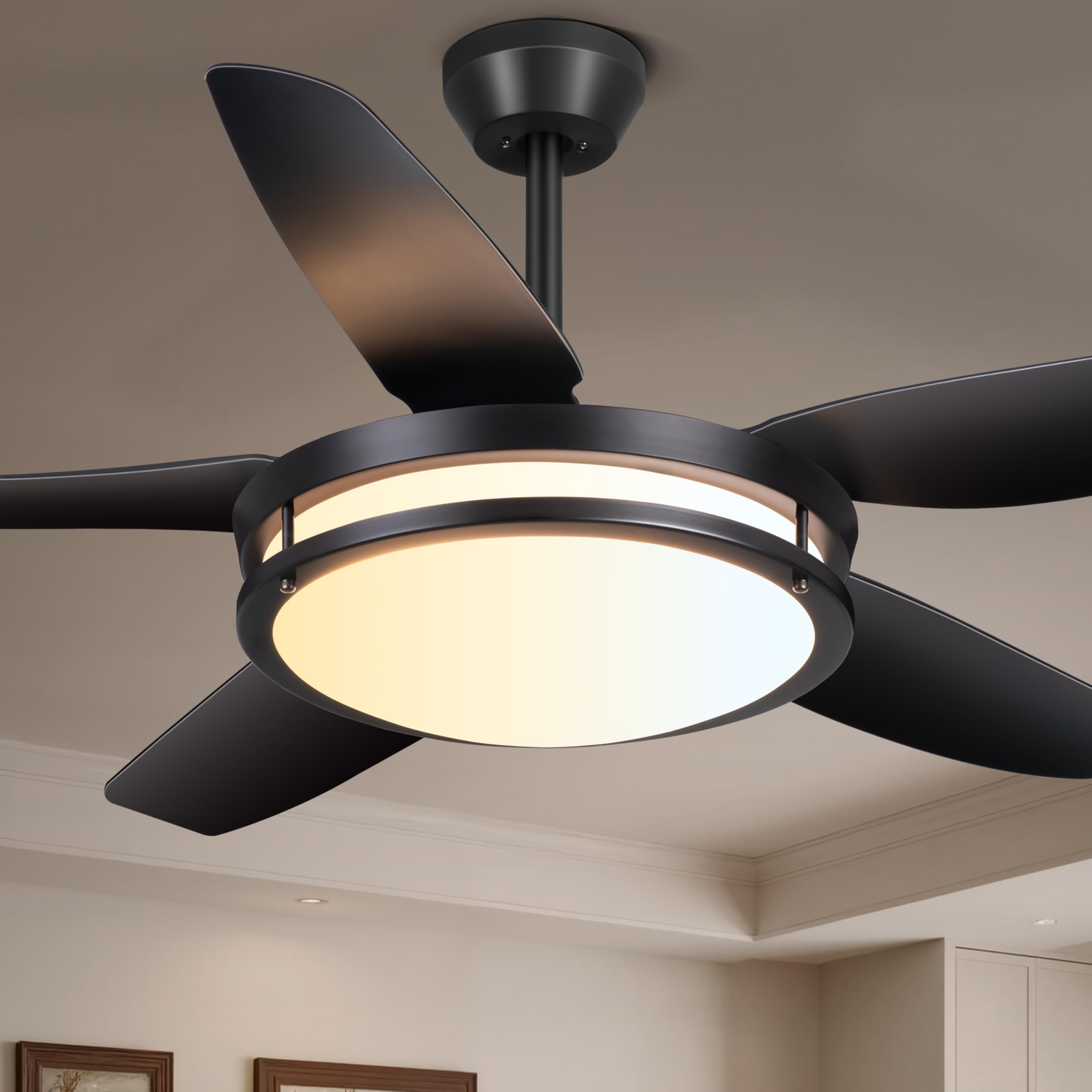 The Ohniyou 48-inch Fandelier Ceiling Fan with Light (Model GLX120) combines the functionality of a ceiling fan with integrated LED lighting. Designed for both indoor and covered outdoor spaces, this unit offers versatile control and efficient air circulation.