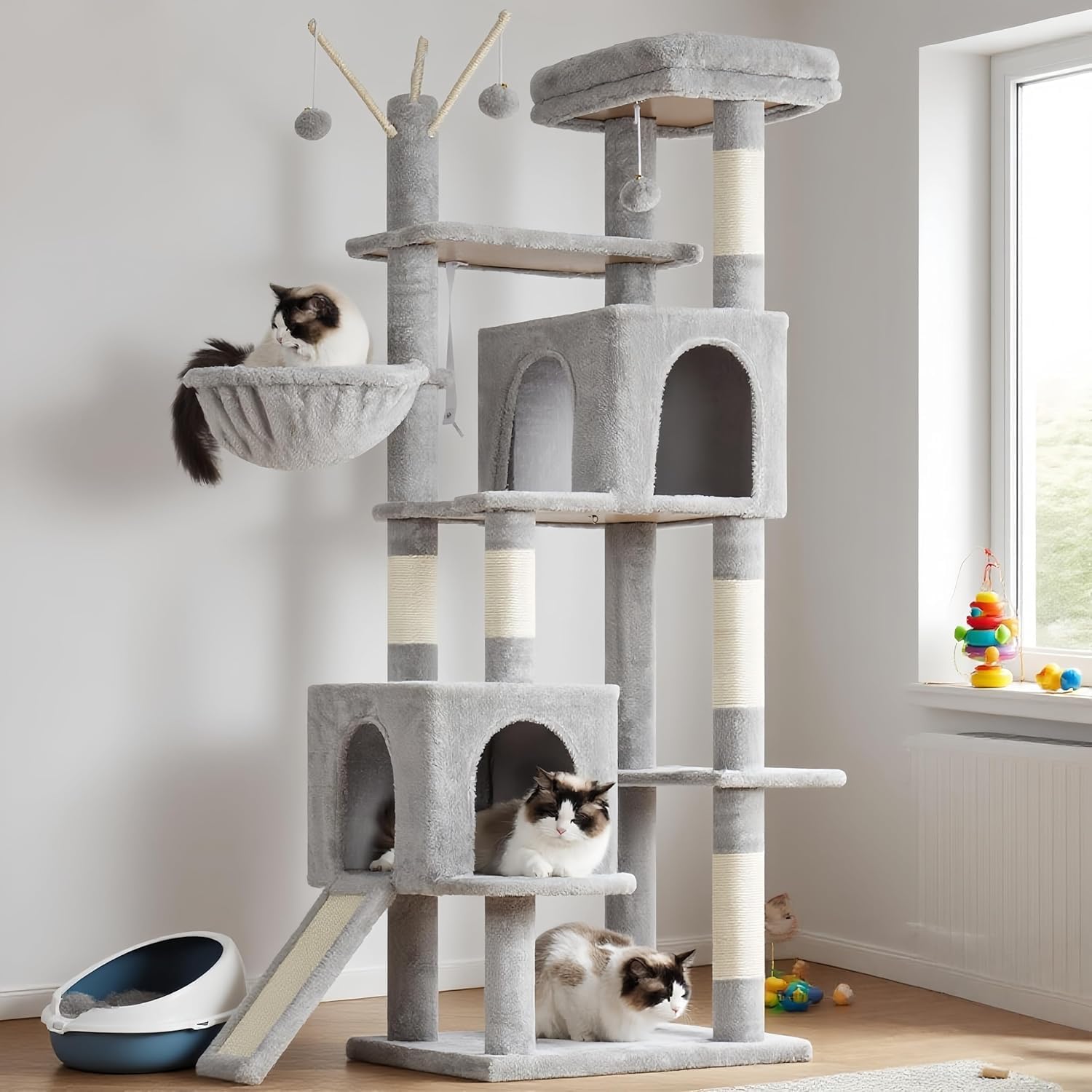- Scratching Posts and Board: Multiple sisal-wrapped posts and a scratch board are integrated to satisfy your cat's natural urge to scratch, helping to protect your furniture.