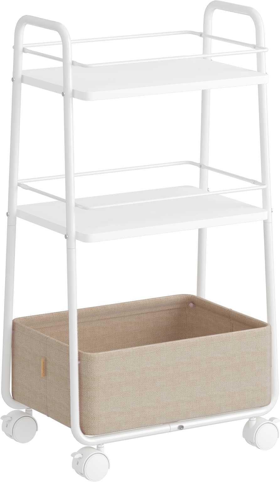 The VASAGLE LILEA Collection 3-Tier Storage Cart (Model LRC001WB01) is a versatile and elegant wheeled trolley designed to enhance storage and organization in various rooms of your home, including the living room, bedroom, and kitchen. It features a sturdy steel frame, two chipboard shelves, and a large, durable fabric basket. Equipped with four castors, two of which are lockable, this cart offers both mobility and stability, making it a practical addition to any space.