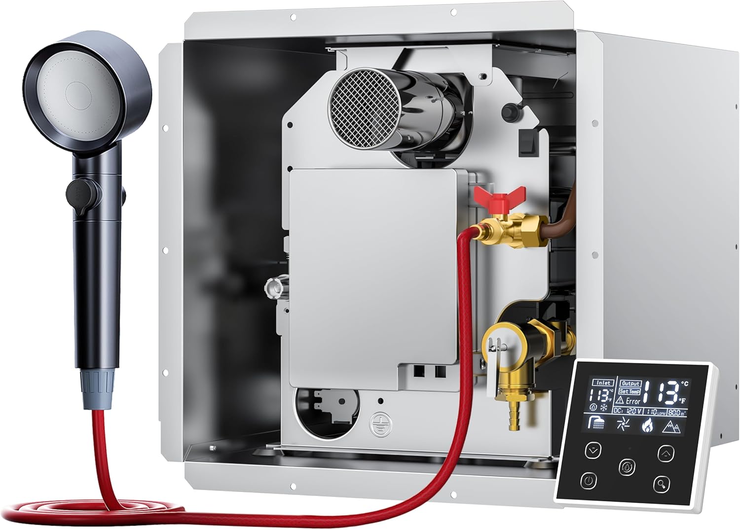 The Ranein ExploreFlow Max is designed to provide continuous hot water for recreational vehicles, featuring high altitude readiness, a multi-function controller, a thermostatic chamber, and an external shower head.