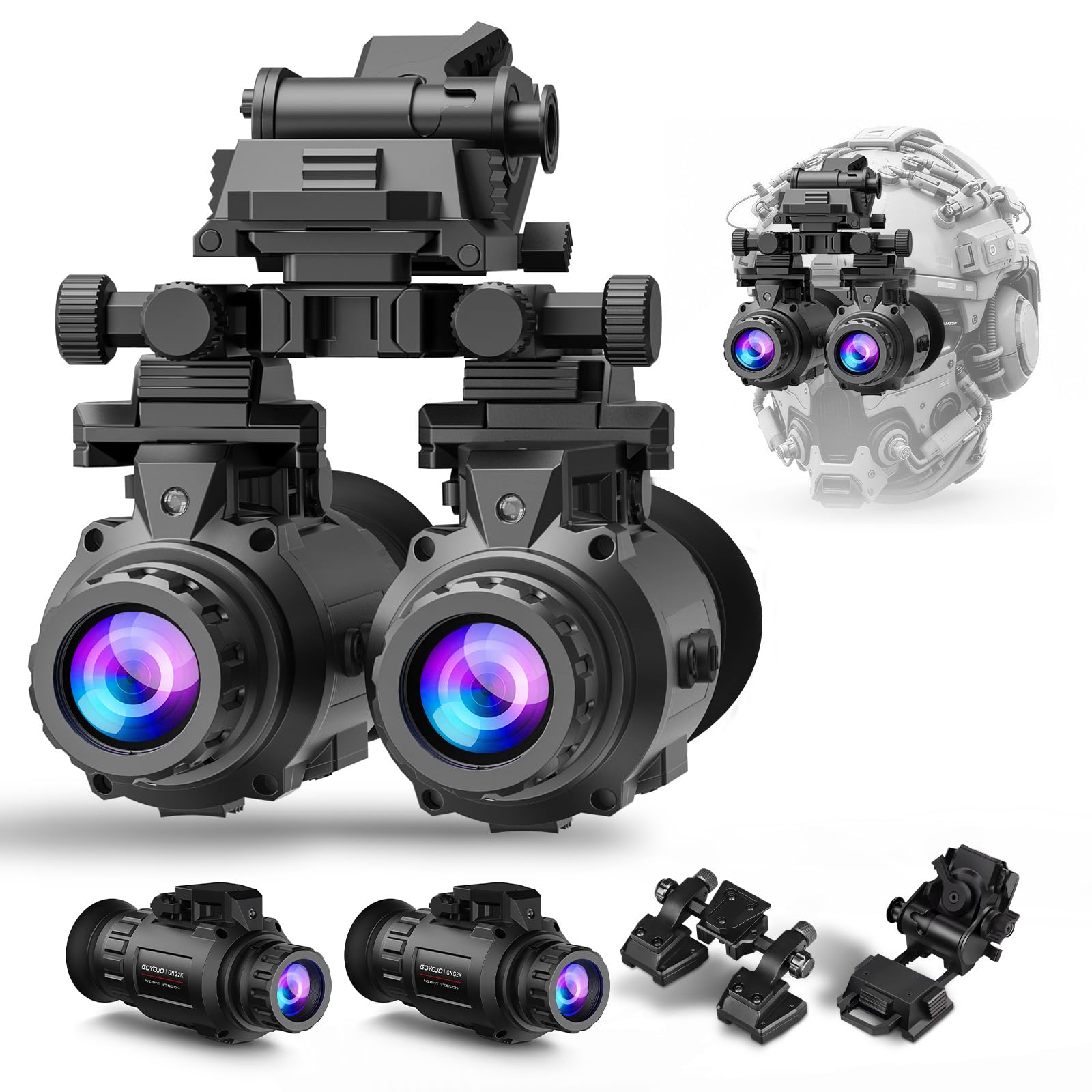 Image: The GOYOJO GNG2K Night Vision Monocular shown both handheld and mounted on a tactical helmet, illustrating its versatility.