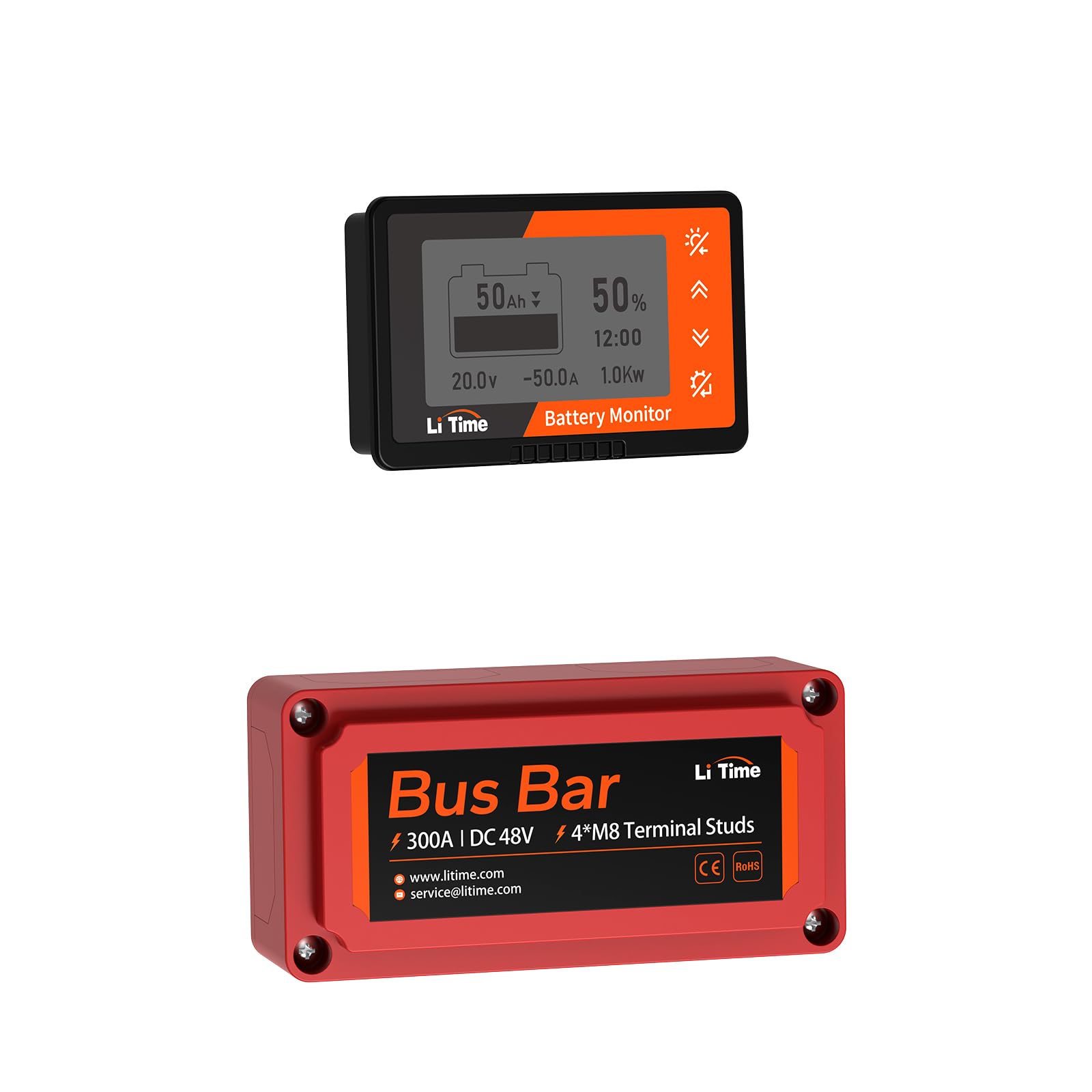 The LiTime 500A Battery Monitor and 300A Bus Bar bundle includes the following main components: