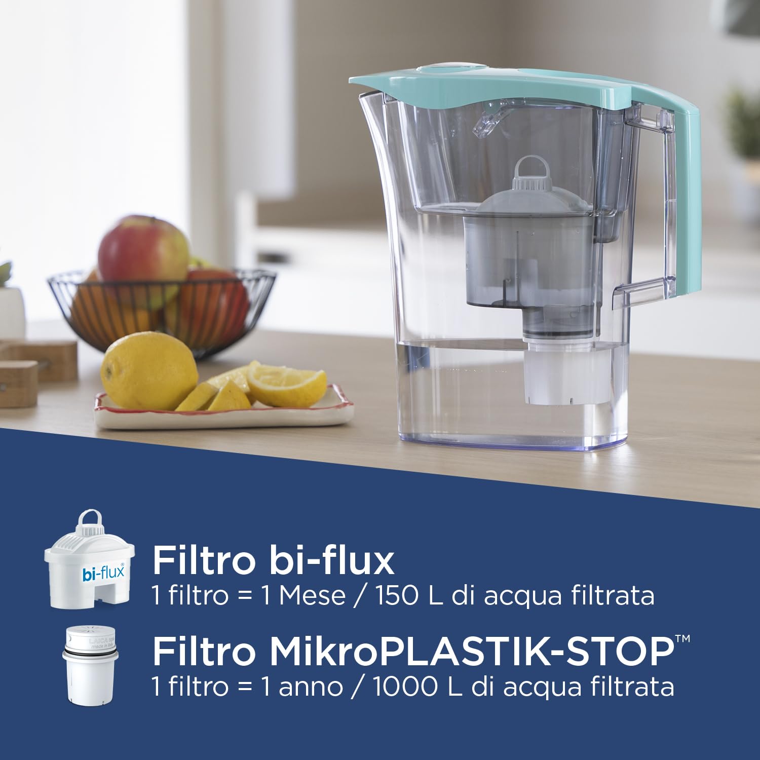 Image: A close-up of the LAICA MikroPLASTIK-STOP filter, detailing its long-lasting performance of 1 year or 1000 liters of filtered water.