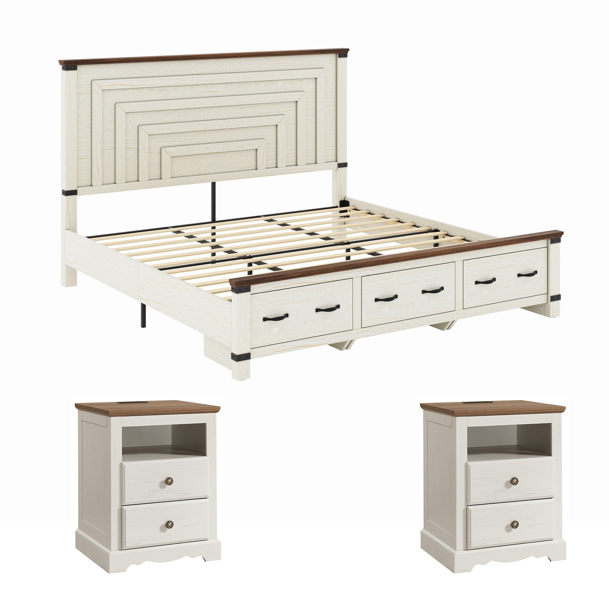 Image: The complete AMERLIFE Farmhouse King Bedroom Furniture Set, featuring the bed frame with storage drawers and two nightstands.